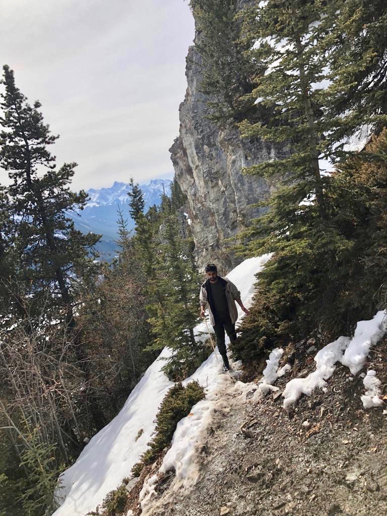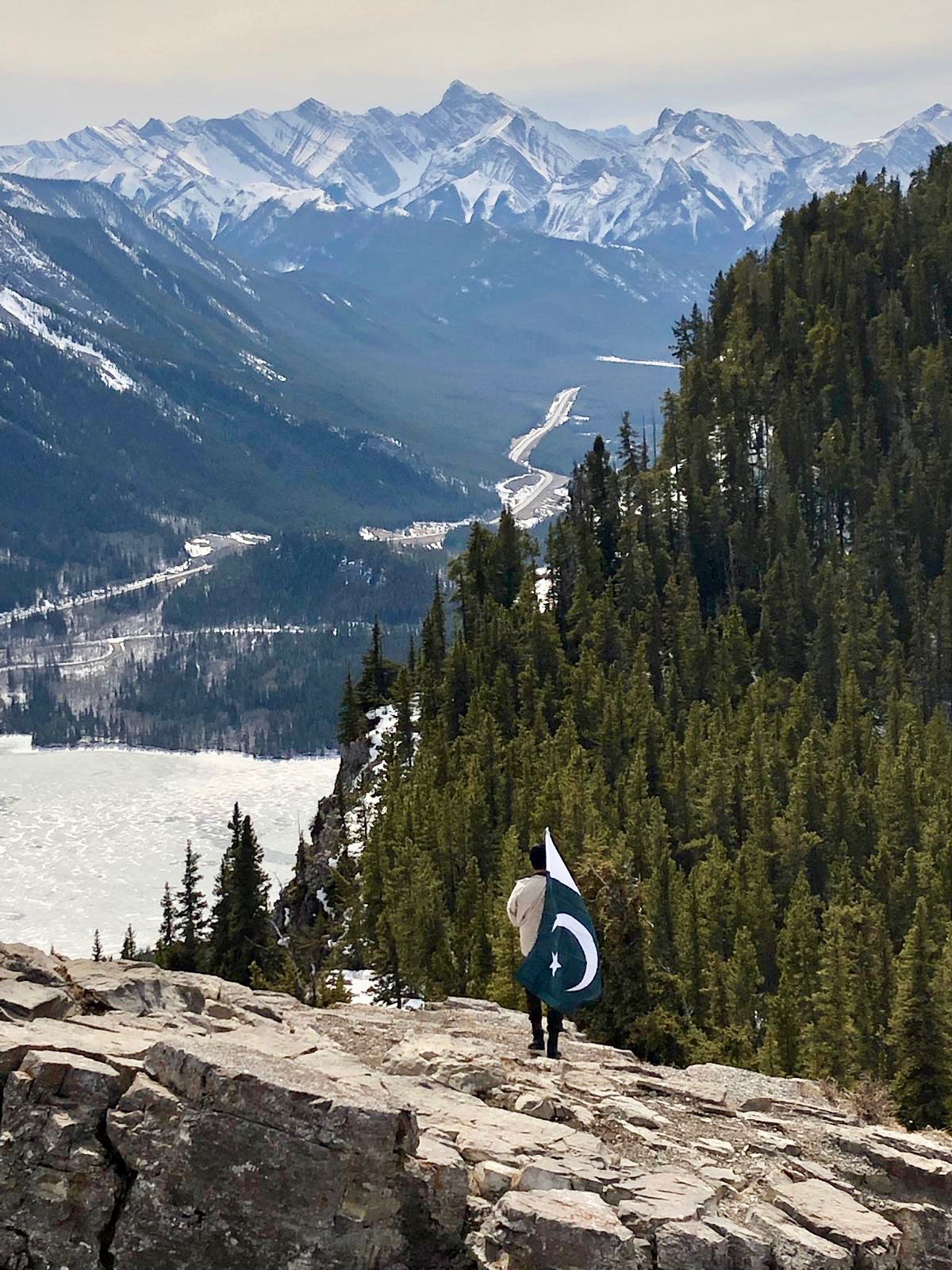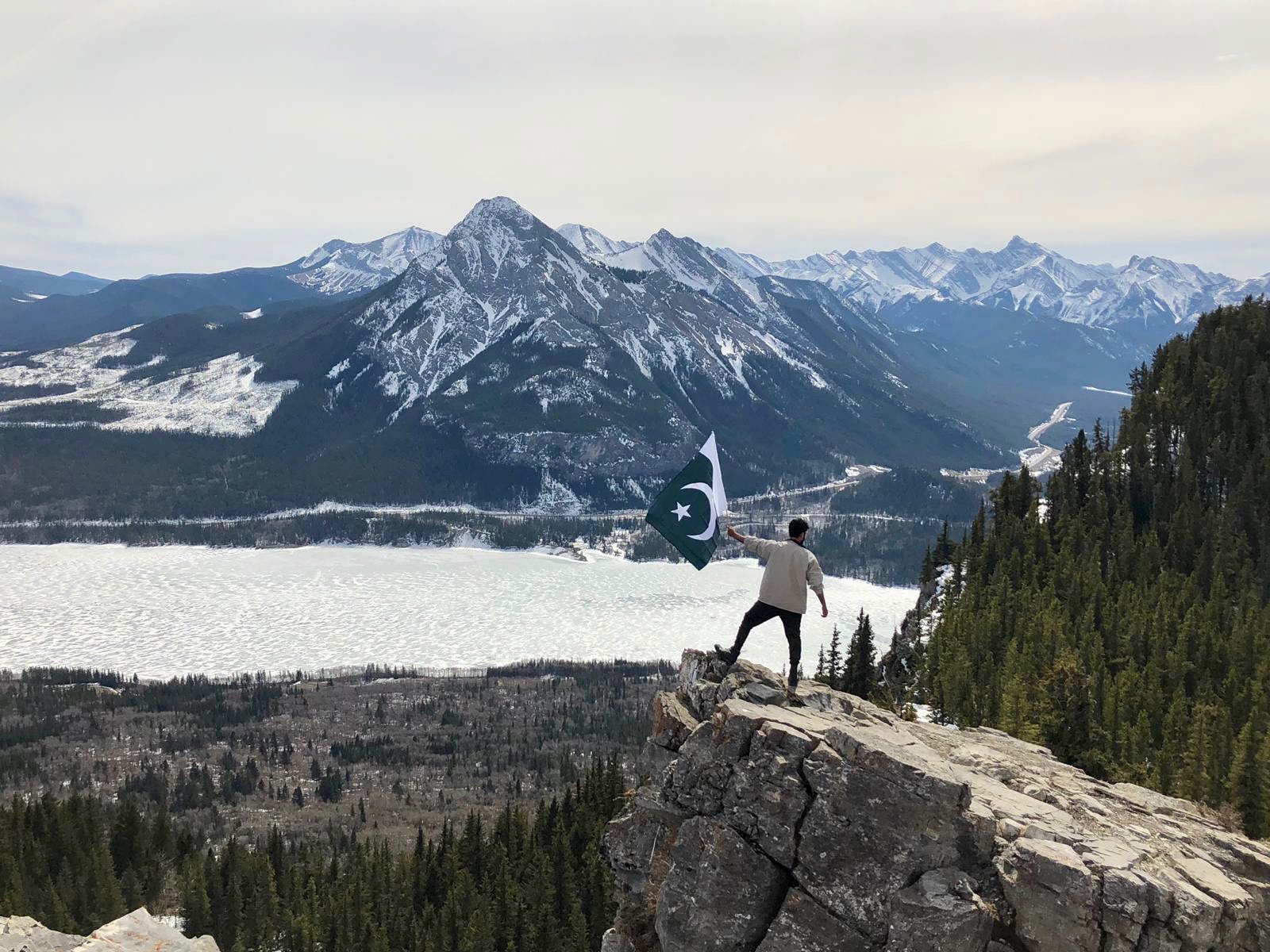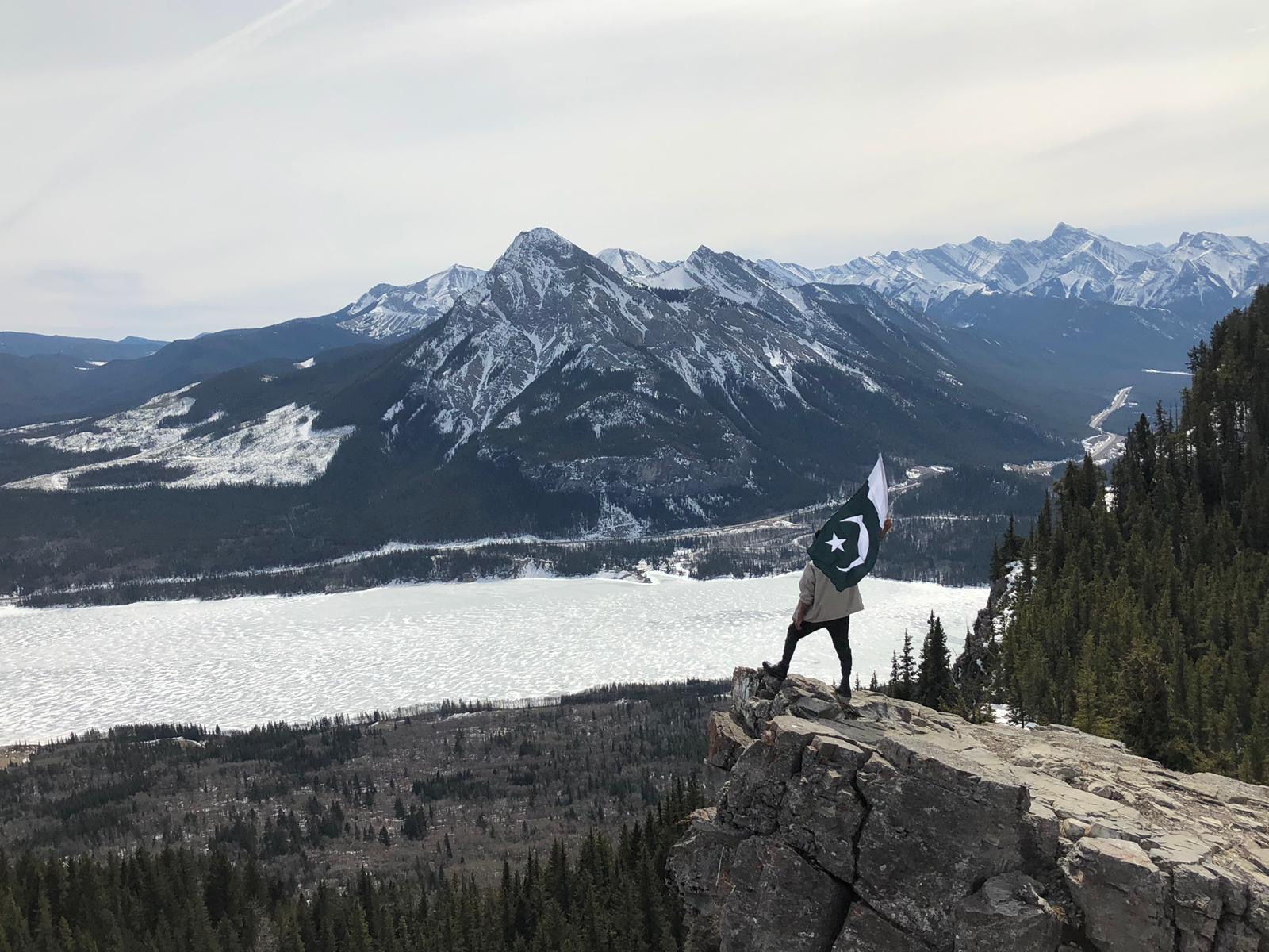We arrived at the ever beautiful frozen Barrier lake with a majestic view of the mountains and began walking towards the direction of what I hoped at that time was the hike. It started just like any other trail in early spring when the snow is melting, there is mud everywhere and you are uncertain of whether you should save your clothes or just give up and roll in the mud. After dense forestry and some beautiful narrow trails, we abruptly came across a beautiful view of the mountains and lake as well as the trail we would follow to get to the top. The top was ridiculously beautiful and I put the Pakistani flag on the pole in order to get ready to complete my bucket list goal. I built up a lot of momentum waving the flag around at the top of a mountain and right as I got the flag to the very “cool” waving position at the edge of the cliff.. the wind died down. It felt like one of those moments when you have used your lung capacity to blow a balloon and are about to tie it but instead, it leaves your grasp, flies around, smacks your forehead and falls down on your feet. After waiting a couple of minutes, Blserp took the flag and did the exact same thing I did but of course, the wind was back. My hopes were renewed and once again I took the flag in my hand walked up and…. nothing happened.. again. The picture with the flag became the longest time I had ever posed for a photo, even beating the time when an uncle was trying to figure out which way to hold a phone when taking a picture at a wedding.