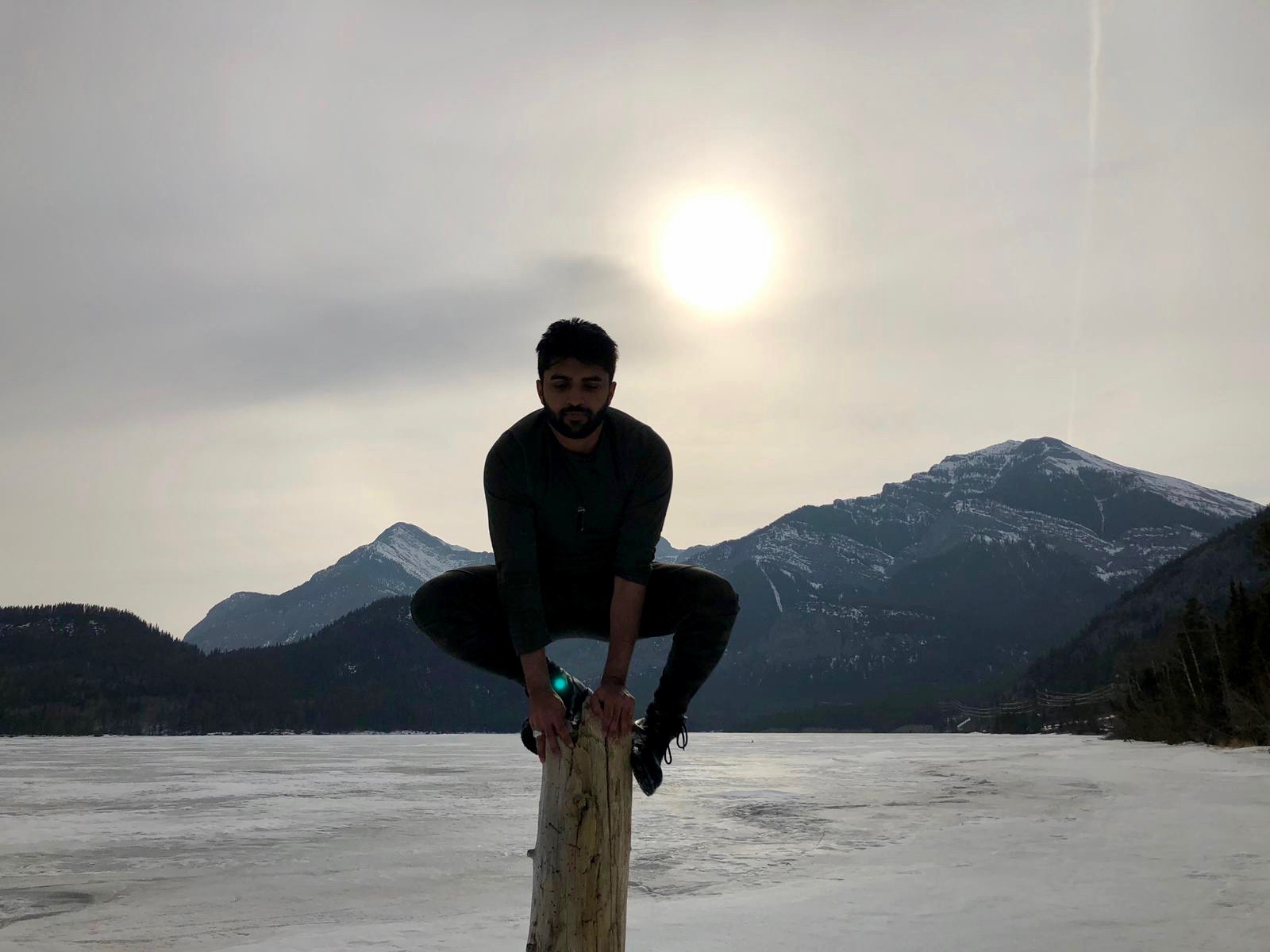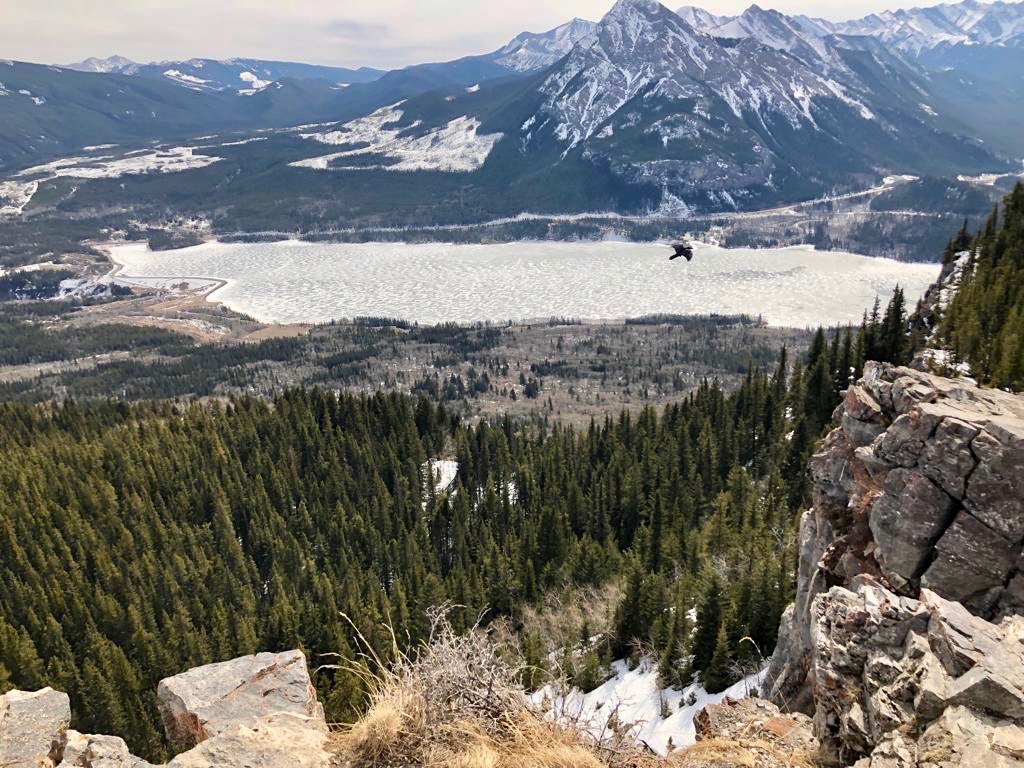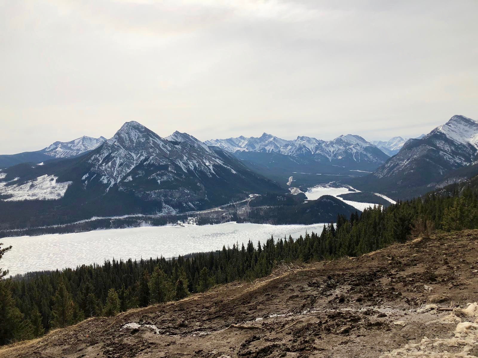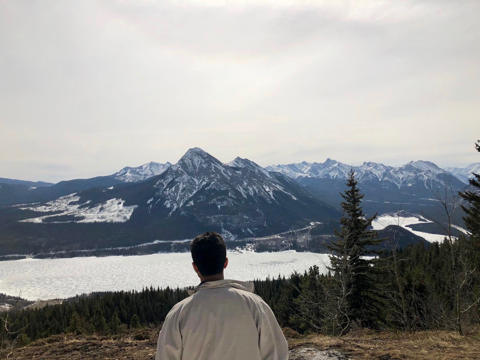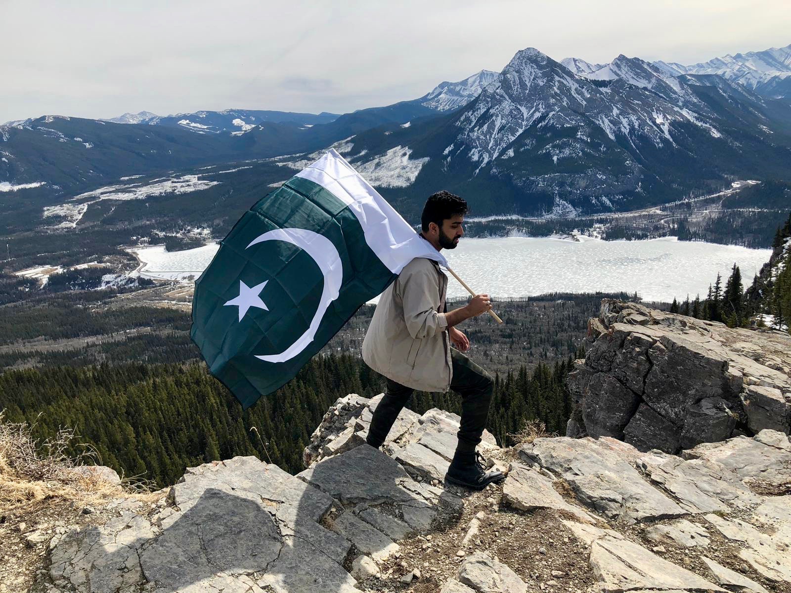 We arrived at the ever beautiful frozen Barrier lake with a majestic view of the mountains and began walking towards the direction of what I hoped at that time was the hike. It started just like any other trail in early spring when the snow is melting, there is mud everywhere and you are uncertain of whether you should save your clothes or just give up and roll in the mud. After dense forestry and some beautiful narrow trails, we abruptly came across a beautiful view of the mountains and lake as well as the trail we would follow to get to the top. The top was ridiculously beautiful and I put the Pakistani flag on the pole in order to get ready to complete my bucket list goal. I built up a lot of momentum waving the flag around at the top of a mountain and right as I got the flag to the very “cool” waving position at the edge of the cliff.. the wind died down. It felt like one of those moments when you have used your lung capacity to blow a balloon and are about to tie it but instead, it leaves your grasp, flies around, smacks your forehead and falls down on your feet. After waiting a couple of minutes, Blserp took the flag and did the exact same thing I did but of course, the wind was back. My hopes were renewed and once again I took the flag in my hand walked up and…. nothing happened.. again. The picture with the flag became the longest time I had ever posed for a photo, even beating the time when an uncle was trying to figure out which way to hold a phone when taking a picture at a wedding.