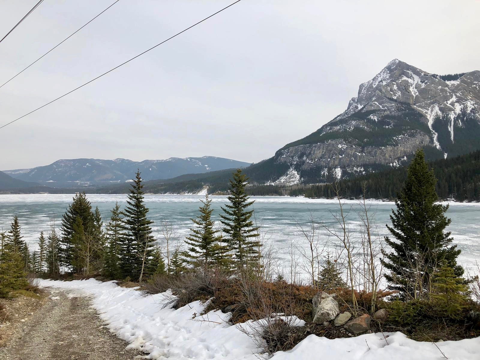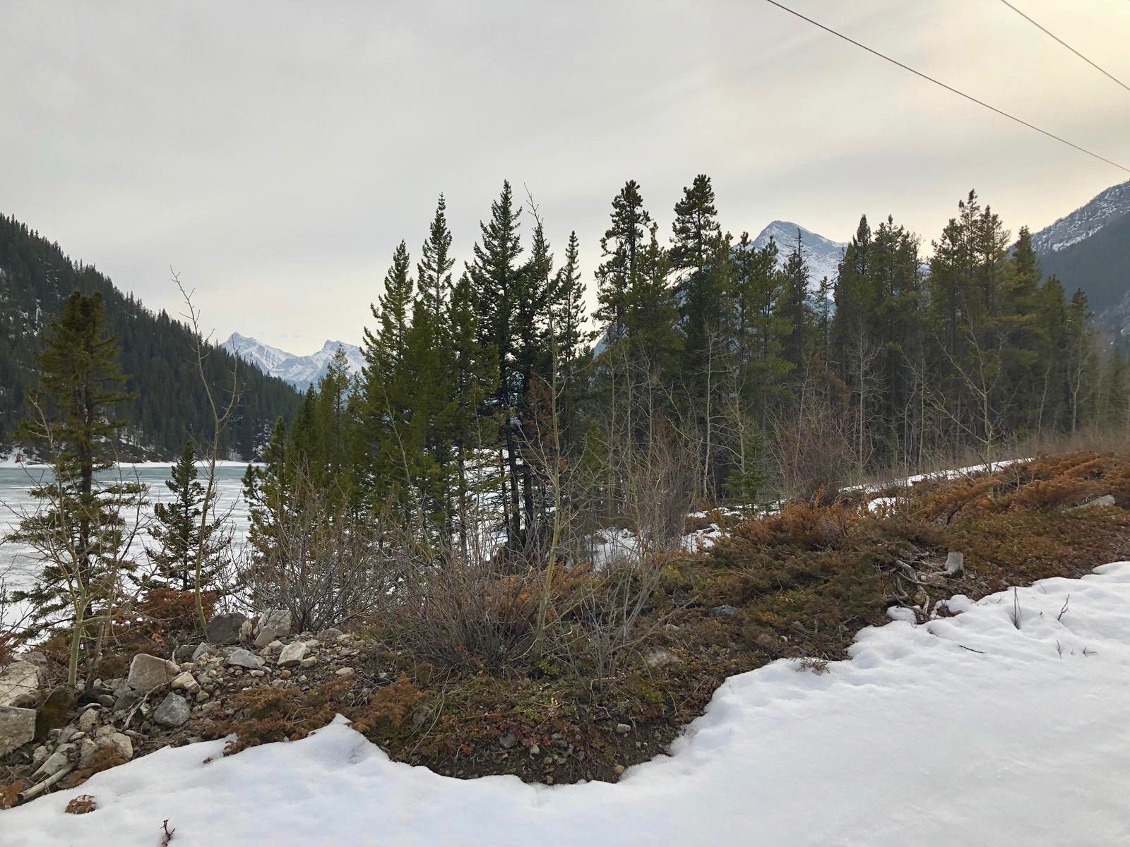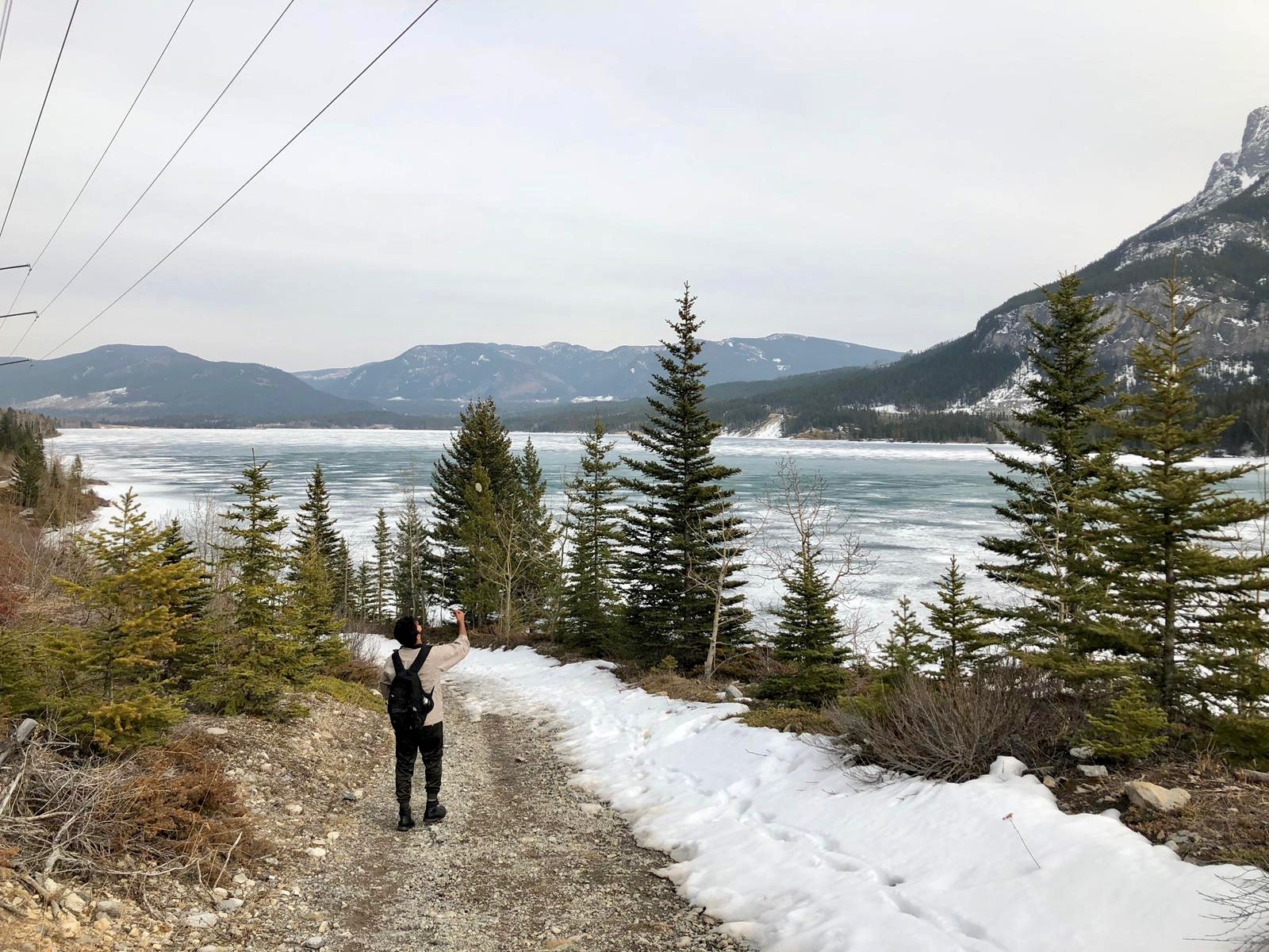 After this, things became interesting. As we were walking down the mountain, in a loop back to the start of the hike, we crossed a bridge with a giant frozen waterfall that was beginning to melt. On the frozen ice itself, there were some rather large paw prints, which I assumed were from a bear (I always go with a bear). Once the path opened up towards Barrier Lake we decided that we had been normal humans enough and it was time to walk on the thawing lake itself. On the lake, we came across a random gigantic log sticking up, that we decided to climb. We then noticed that around the log there were scores of tiny ants. The ants had somehow built a house in the middle of a lake on a frozen log. As we were examining the ants, Blserp received a fright because his foot went in an area where the ice was getting thin and melting. We quickly started running back to solid ground in case a titanic moment happened, since there was only one log after all and as much as girls love him, I did not wish to be another Jack.