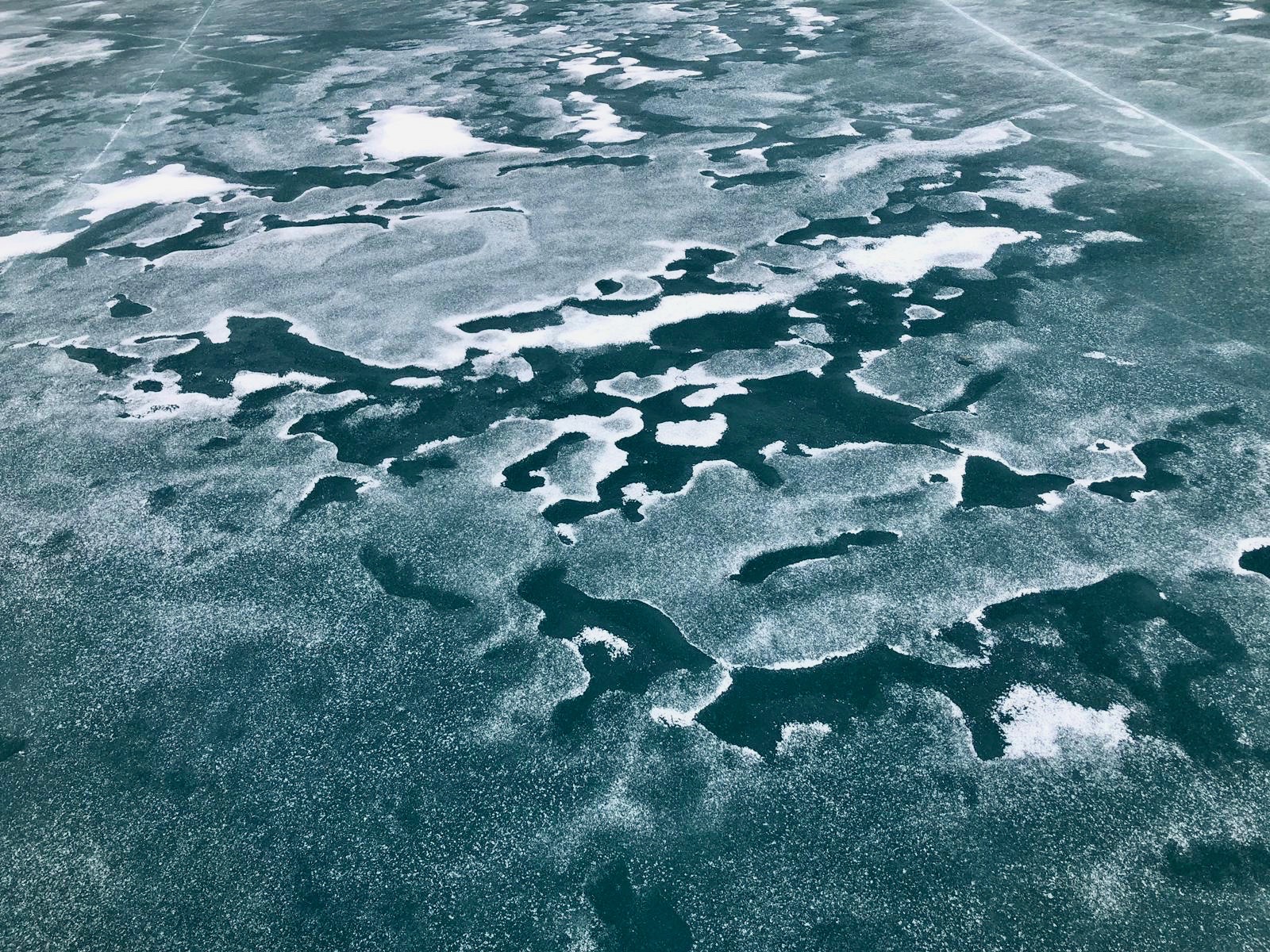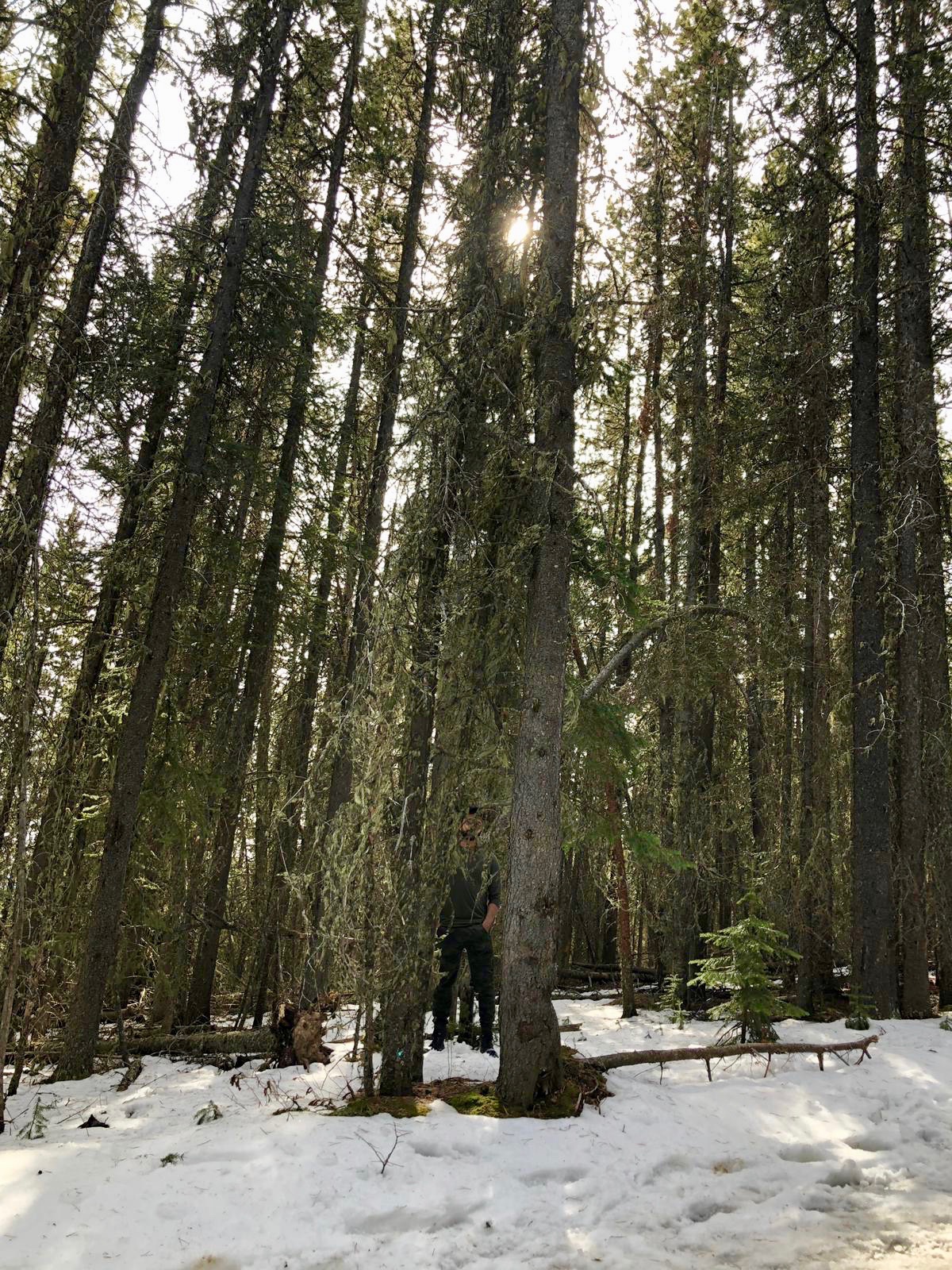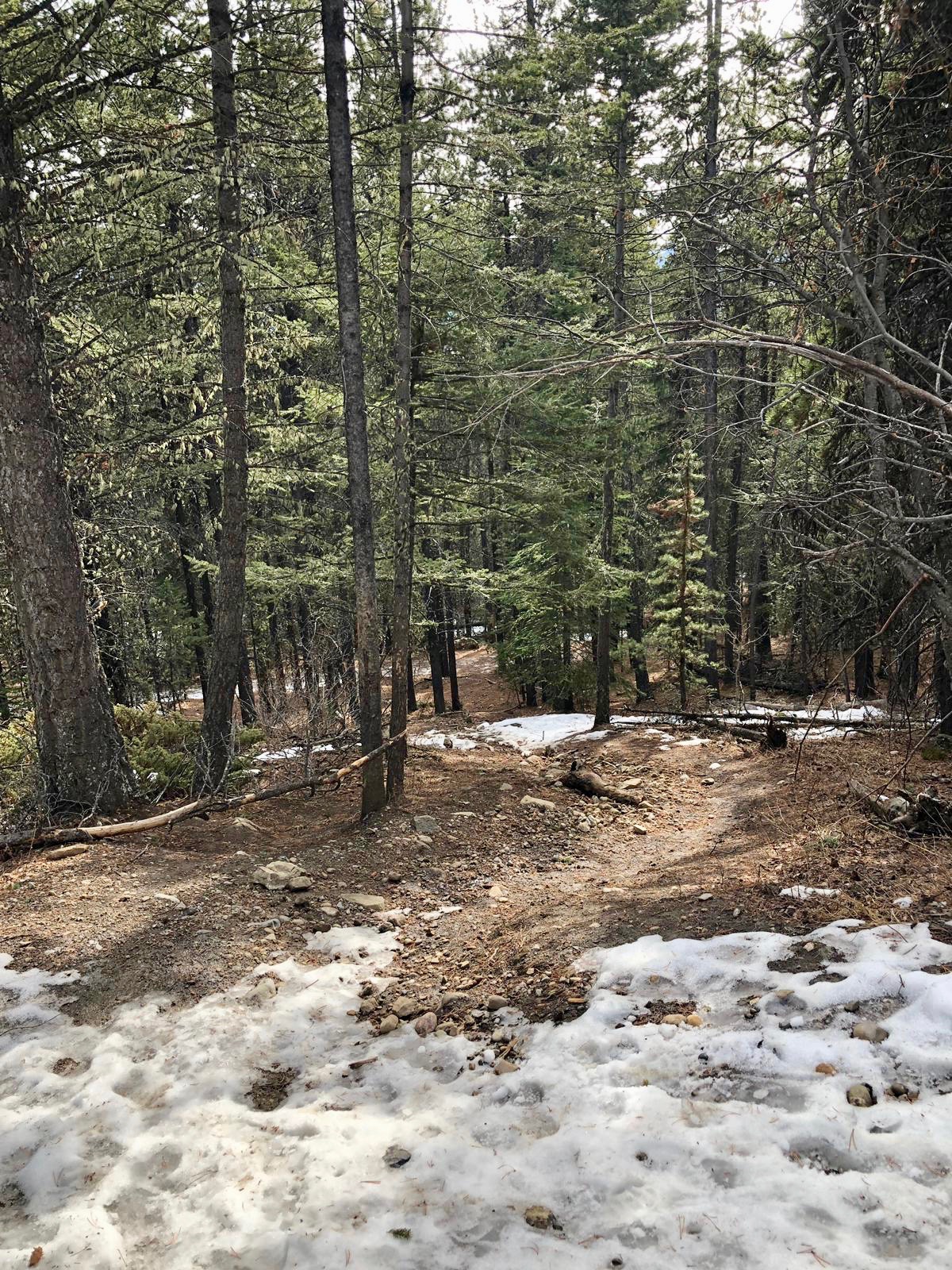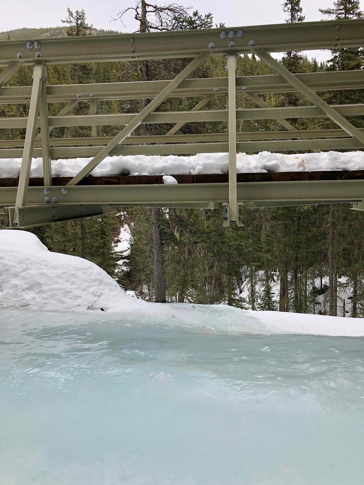 After this, things became interesting. As we were walking down the mountain, in a loop back to the start of the hike, we crossed a bridge with a giant frozen waterfall that was beginning to melt. On the frozen ice itself, there were some rather large paw prints, which I assumed were from a bear (I always go with a bear). Once the path opened up towards Barrier Lake we decided that we had been normal humans enough and it was time to walk on the thawing lake itself. On the lake, we came across a random gigantic log sticking up, that we decided to climb. We then noticed that around the log there were scores of tiny ants. The ants had somehow built a house in the middle of a lake on a frozen log. As we were examining the ants, Blserp received a fright because his foot went in an area where the ice was getting thin and melting. We quickly started running back to solid ground in case a titanic moment happened, since there was only one log after all and as much as girls love him, I did not wish to be another Jack.